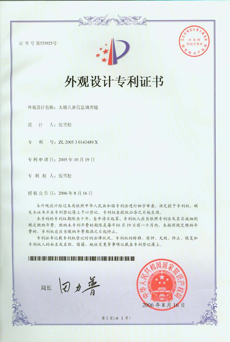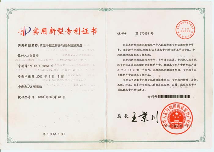 2005年8月25日,大众科技报社,认为张雪松的专利发明:紫微斗数立体多功能命运预测盘,市场前景广阔,经济效益及社会效益较好,符合国家产业政策,我社决定纳入2005年重点推广项目。